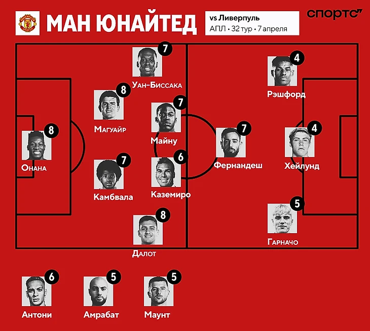 Бруну Фернандеш (7) – много неточных передач в первом тайме. Мог пораньше отдать на Алехандро Гарначо, пока тот не убежал в офсайд. Ближе к концу первой 45-минутки провалил потенциально опасную контратаку «Юнайтед», когда ему никто не мешал. Во втором классно, быстро оценил ситуацию и пробил в касание после ошибки Куансы.
