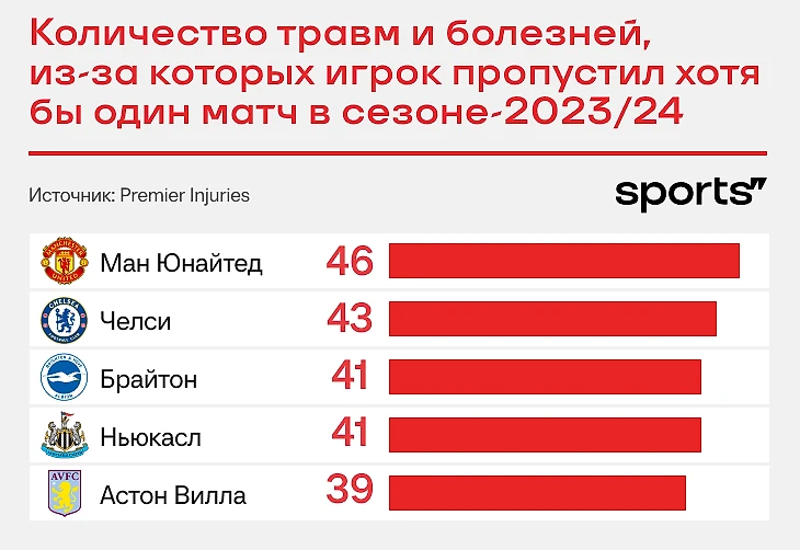 Восьмое место в АПЛ – жесткий провал. Но сложно оспорить, что травмы стали фактором стремительного падения. В Premier Injuries подсчитали: «Юнайтед» на первом месте в лиге по вылетам футболистов в кампании-2023/24.