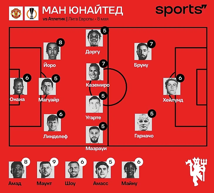 Расмус Хейлунд (6) – весь матч страдал, снова не мог зацепиться за мяч, проигрывал дуэли. Но в итоге ушел с голом: правильно открылся и поборолся в штрафной, когда Амад выкатил на пустые.