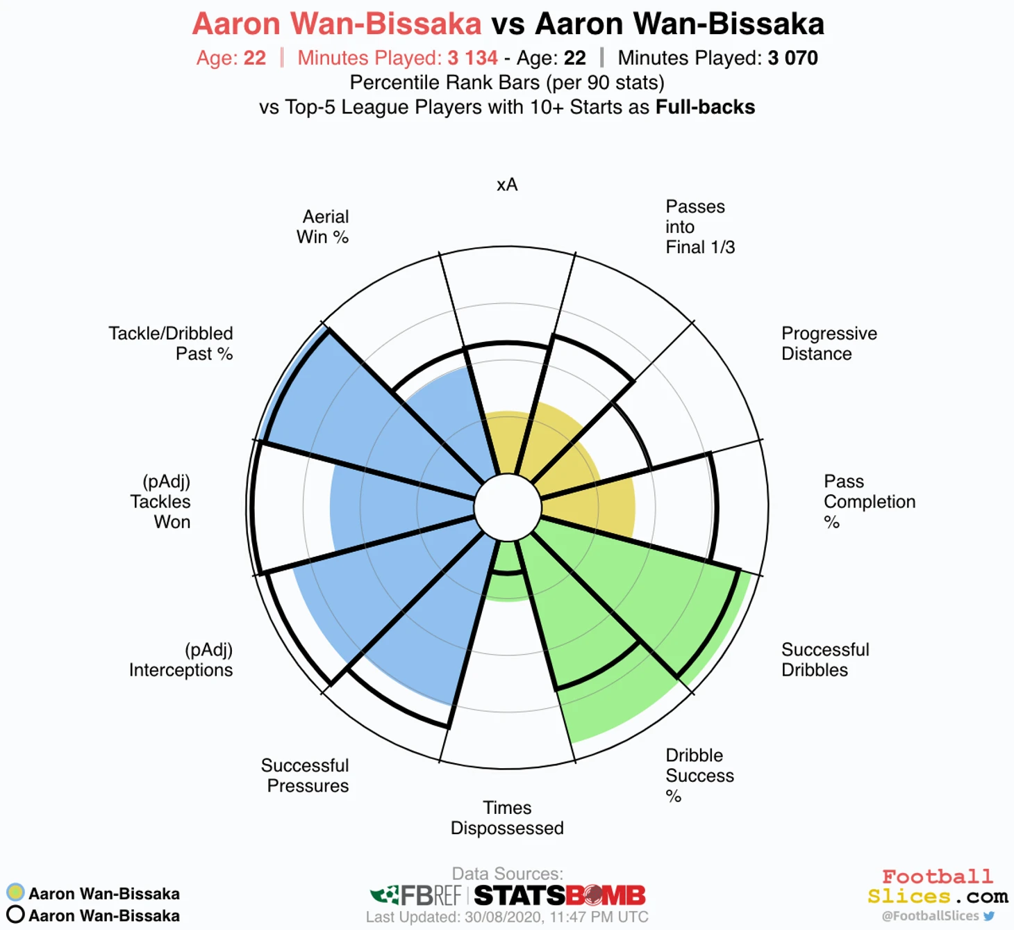 Глядя на этот радар, можно сделать поверхностный вывод, что Аарон стал гораздо чаще отбирать мяч и немного чаще перехватывать, перейдя в МЮ.