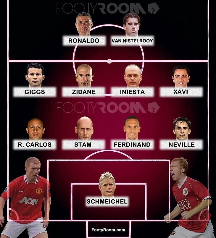 Как оказалось, в команде нашлось место не только легендарным «дьяволам» (Невилл, Гиггз, Шмейхель, Стам, ван Нистелрой, Фердинанд, Роналду), но и представителям Испании (Хави и Иньеста из «Барсы» и двое из мадридских «галактикос» — Роберто Карлос и Зидан).