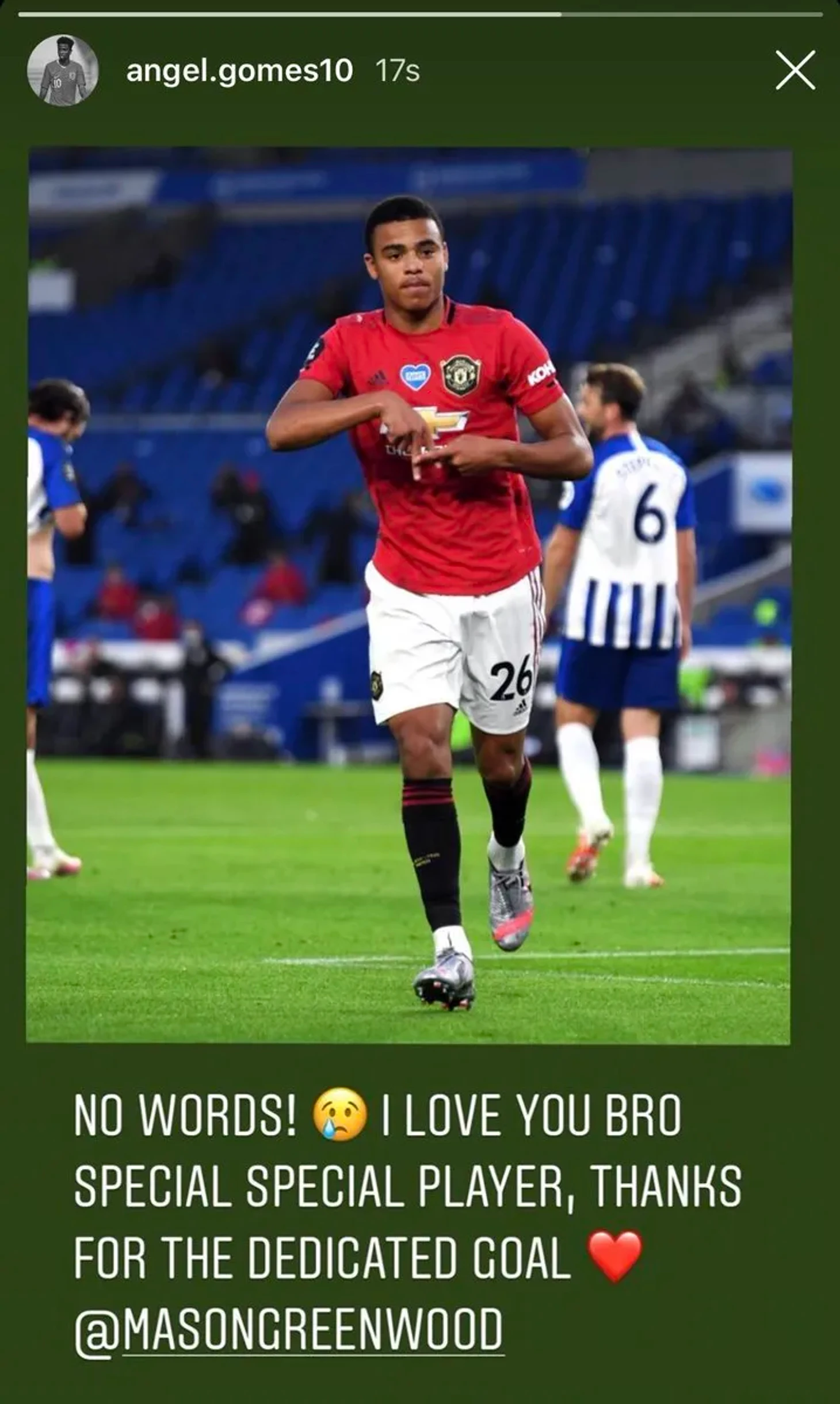 Гринвуд открыл счет в матче с «Брайтоном». Мэйсон, празднуя, показывал букву «А». Как оказалось позже, видимо, это означало Angel, судя по инстасторис Эйнджела Гомеса.