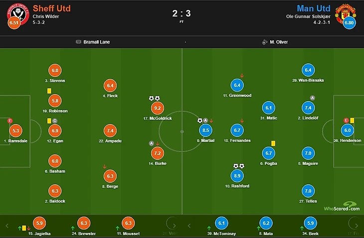 После матча «Шеффилд Юнайтед» и «Манчестер Юнайтед» портал WhoScored опубликовал оценки игрокам каждой из команд.