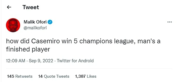 @malikofori (Twitter): «Как Каземиро удалось 5 раз выиграть ЛЧ? Он конченный игрок».