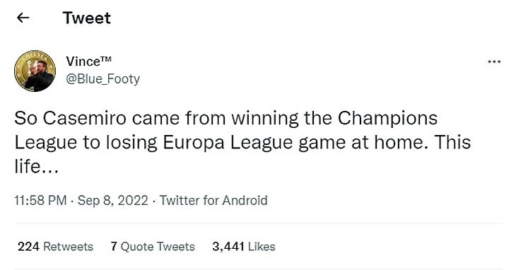 @Blue_Footy(Twitter): «Каземиро прошел путь от победы в Лиге чемпионов до поражения дома в Лиге Европы – это жизнь…».