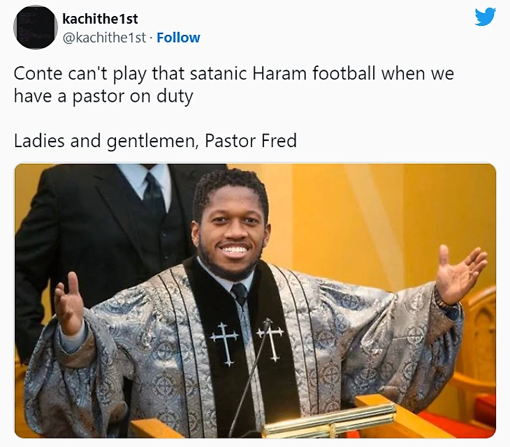 «Когда у нас есть пастор, Конте не может играть в сатанинский футбол. Леди и джентльмены, пастор Фред!»
