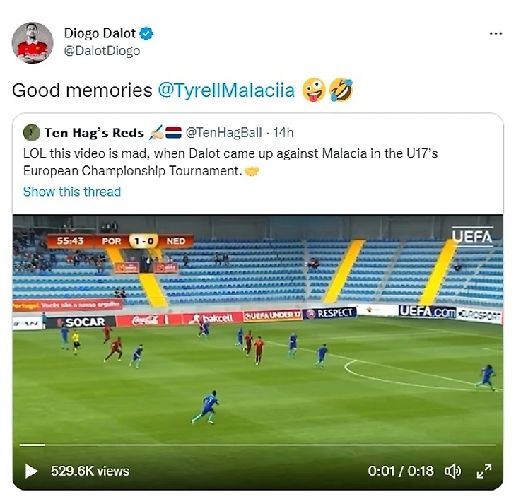 Диогу Далот напомнил нам всем и Тиреллу Маласиа в частности, о полуфинале Евро 2016 между юношескими сборными Португалии и Нидерландов до 17 лет. Ныне товарищи по «МЮ» Далот и Маласия противостояли друг другу в том матче. Победа осталась за португальцами (2:0), а Далот стал одним из авторов голов.