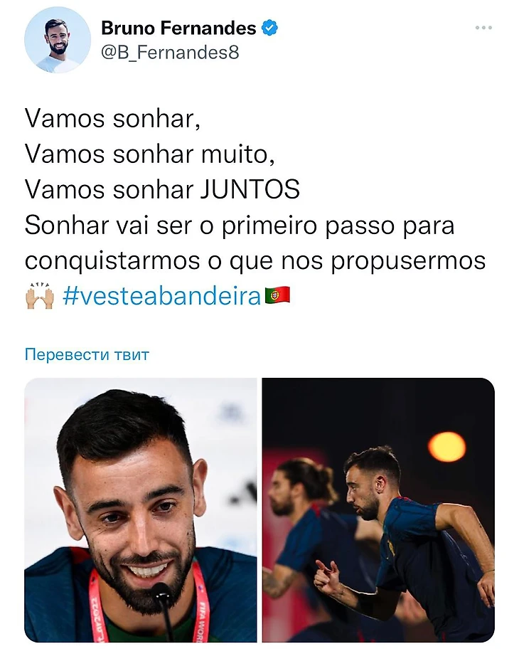 В четверг вечером сборная Португалии дебютирует на ЧМ-2022 в сложнейшем матче против Ганы. Накануне игры полузащитник «МЮ» Бруну Фернандеш обратился к болельщикам: «Давайте мечтать, Давайте мечтать по-крупному, Давайте мечтать вместе, Мечты будет первым шагом к достижению того, что мы хотим🙌🏼»