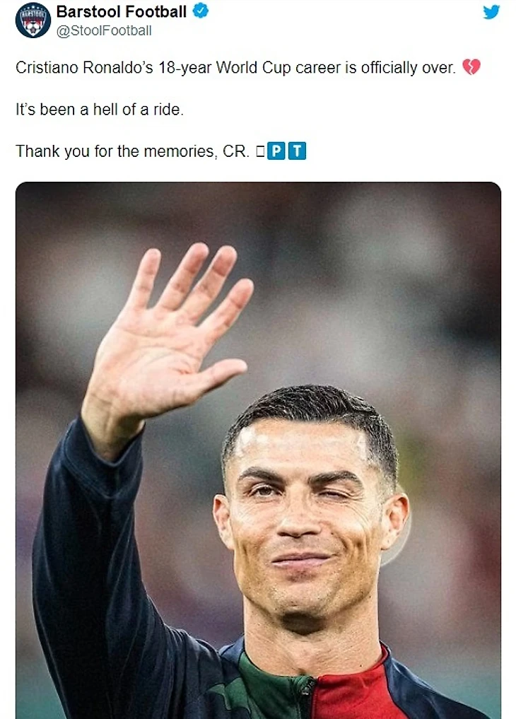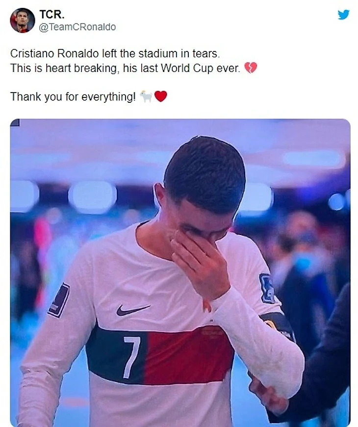 «Криштиану Роналду покинул стадион в слезах. Сердце разрывается – это его последний чемпионат мира в карьере. Спасибо тебе за все!».