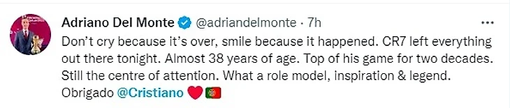 «Не плачь из-за того, что это закончилось, улыбайся, потому что это было. CR7 отдал все силы сегодня. Ему почти 38 лет. Он два десятилетия был на вершине и остается в центре внимания. Какая ролевая модель, вдохновение и легенда. Спасибо!».