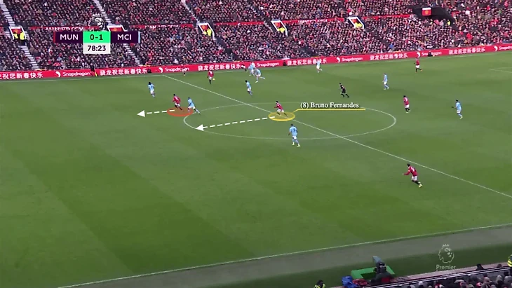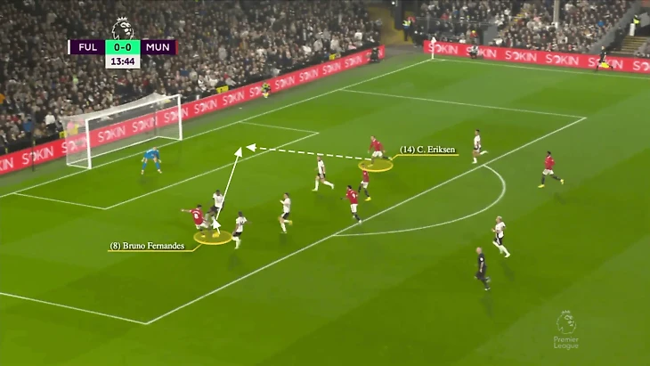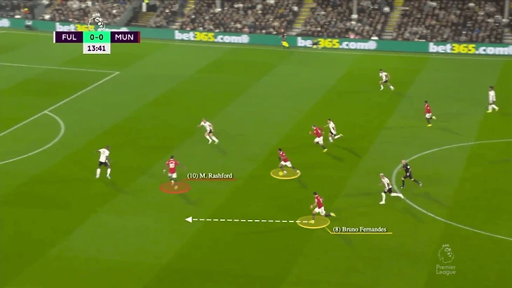 Во время гола Эриксена в ворота «Фулхэма» Бруну замечает Рэшфорда, который тянет защитника вперед и освобождает зону.