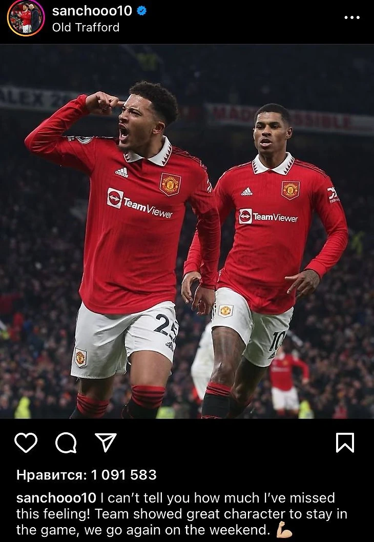 Вчера Санчо забил свой первый гол с сентября прошлого года. Товарищи по «Манчестер Юнайтед» поддержали его в соцсетях