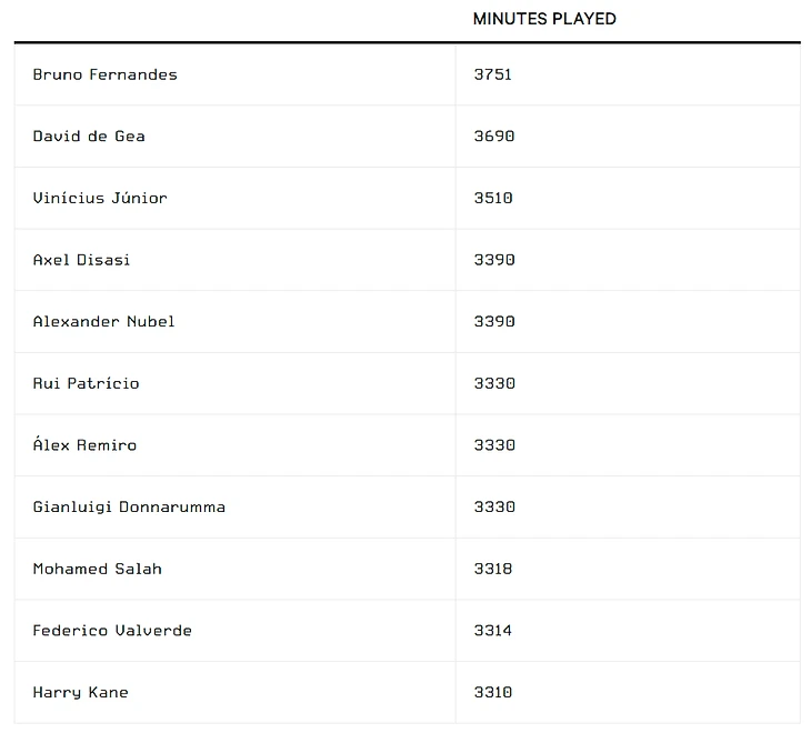 В сезоне-2022/2023 на счету Фернандеша 3751 сыгранная во всех турнирах минута. Следующим в списке идет... Давид Де Хеа, у которого 3690 минут. На третьем месте − Винисиус Жуниор, с 3510 минутами. В десятку вошли сразу пять вратарей.