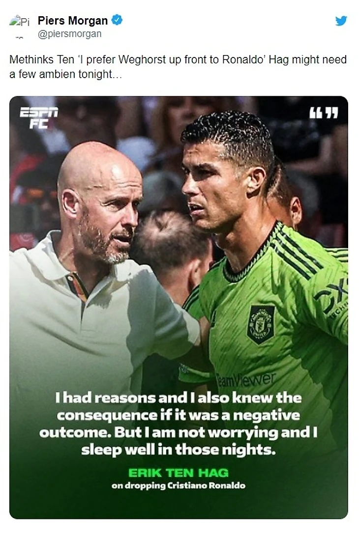 Пирс Морган воспользовался Twitter, он вспомнил старую цитату тренера, когда тот заявил, что спокойно спит по ночам, несмотря на решение по Роналду. Журналист высказал предположение, что после прошедшего матча ситуация поменяется.