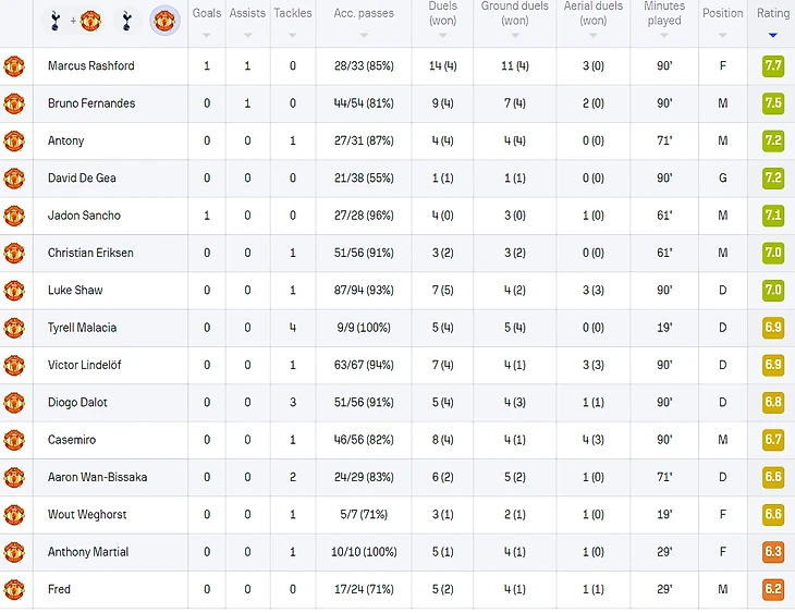 Гостевой матч «Юнайтед» против «Тоттенхэма» завершился обидной ничьей − 2:2. В первом тайме команда Тен Хага выглядела намного свежее и интереснее соперника. Сперва Санчо забил быстрый гол, а под занавес первого тайма успех развил Рэшфорд.