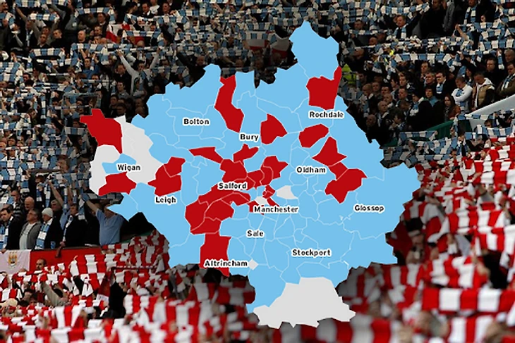 В опросе приняло участие более 2000 человек. Что можно сказать? «Юнайтед» немного популярнее в центральном округе города, особенно в районе стадиона клуба - в Сэлфорде. С другой стороны, «Сити» правит в историческом центре города, который и называется Манчестером, и, как вы заметили, на окраинах.