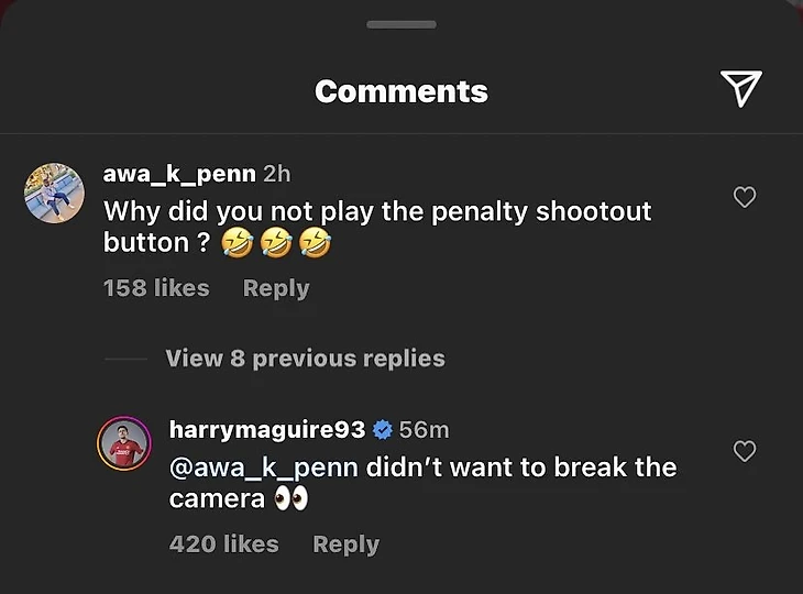 Но после матча фанат в соцсетях спросил у Харри, почему он не пробил одиннадцатиметровый. Ответ Магуайра получился забавным: