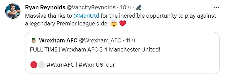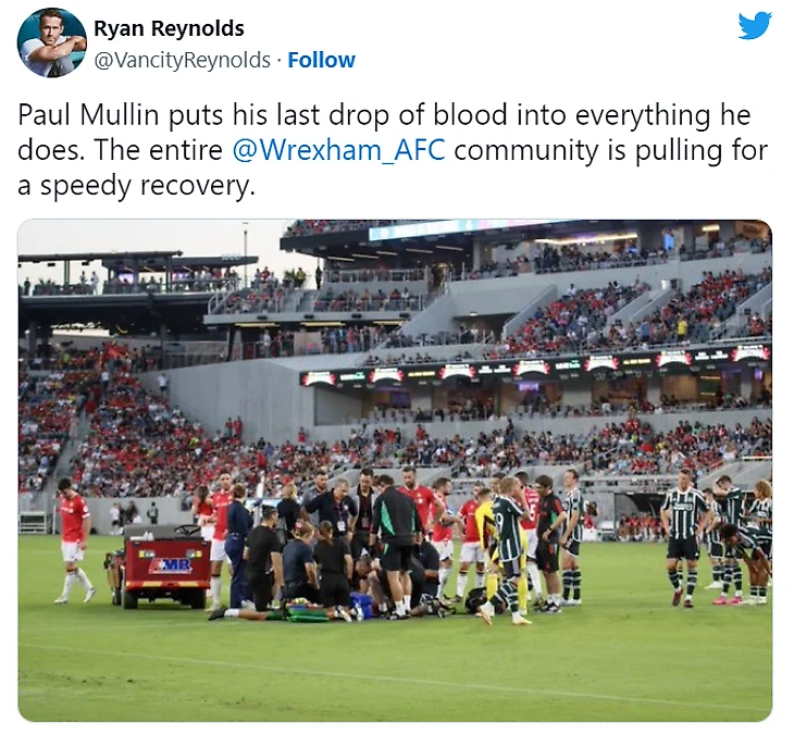 Позже с официальным заявлением выступил совладелец «Рексхэма» Райан Рейнолдс: «Пол Маллин борется до последней капли крови. Вся команда «Рексхэма» желает ему скорейшего выздоровления. Огромное спасибо «МЮ» за невероятную возможность сыграть против легендарной команды АПЛ».