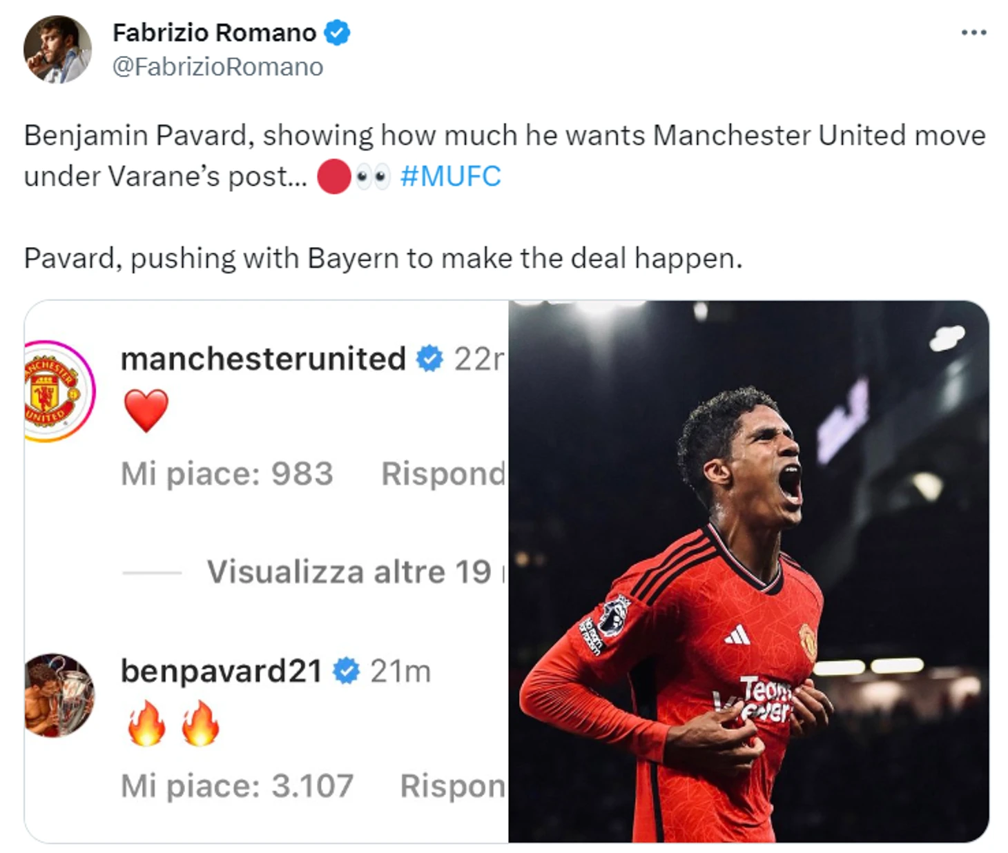 На это обратил внимание Фабрицио Романо. Инсайдер написал: «Под постом Варана Бенжамен Павар показывает, как сильно хочет перейти в «Манчестер Юнайтед». Павар подталкивает «Баварию» к одобрению сделки».