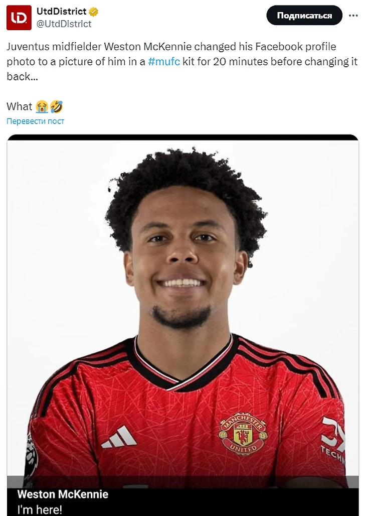 В пятницу днем игрок «Юве» Уэстон Маккенни внезапно сменил фотографию профиля. Вместо привычной картинки в форме туринского клуба появилось изображение, на котором он одет в майку «Манчестер Юнайтед».