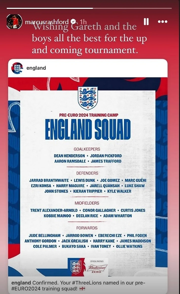 В своей истории в Инстаграм он поделился составом сборной Англии с подписью: «Желаю Гарету и парням всего наилучшего в предстоящем турнире».