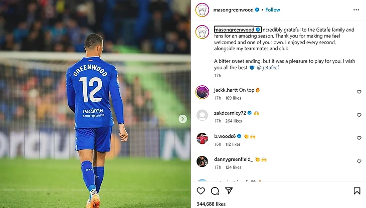 «Спасибо, что дали почувствовать себя одним из вас». Мэйсон Гринвуд прощается с «Хетафе»
