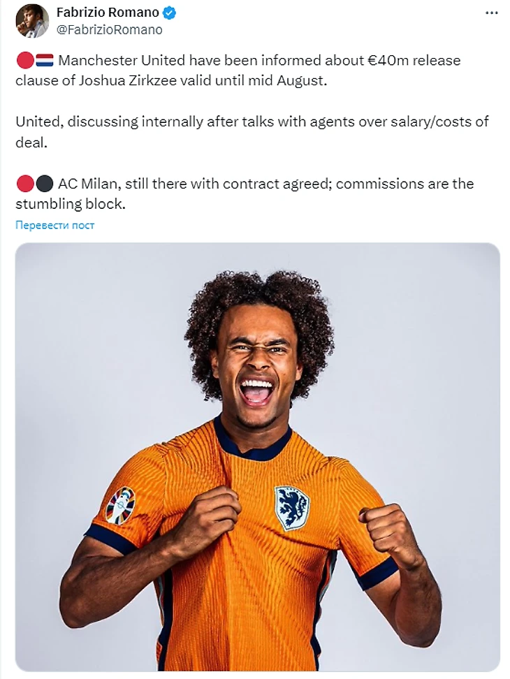 По словам Фабрицио Романо, «Манчестер Юнайтед» заинтересован в приобретении Джошуа Зиркзе из «Болоньи».
