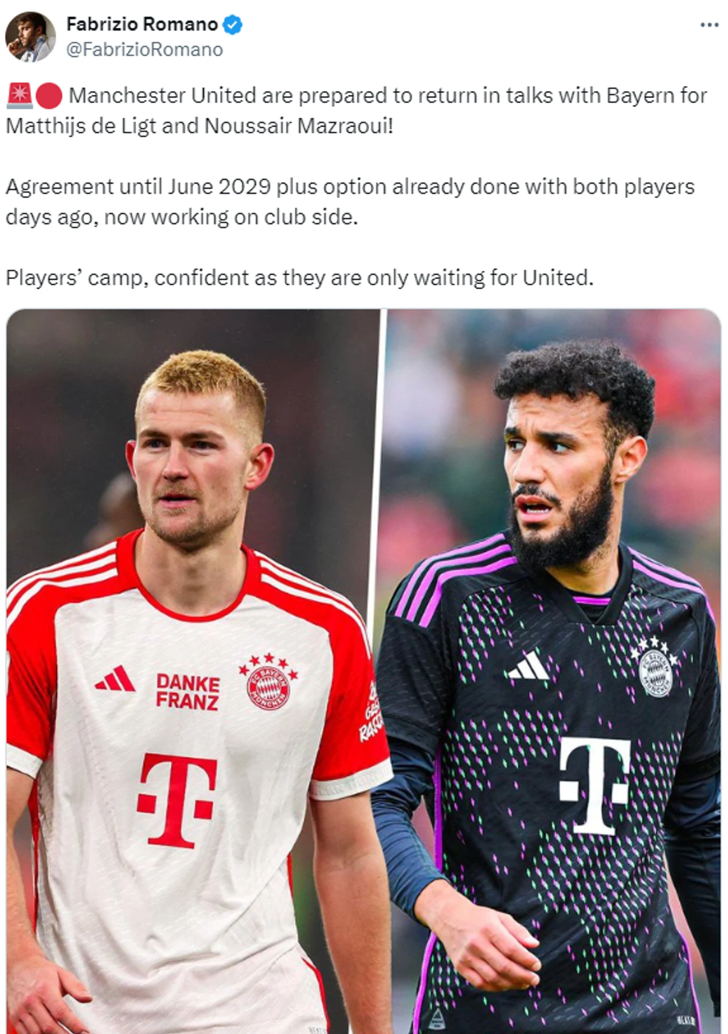 Трансферная сага Нуссаира Мазрауи и Маттейса Де Лигта продолжается. «Ман Юнайтед» все же намерен подписать игроков «Баварии», утверждает Фабрицио Романо: