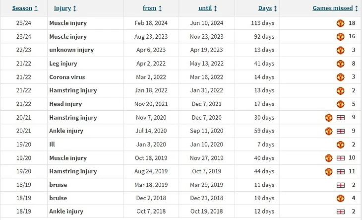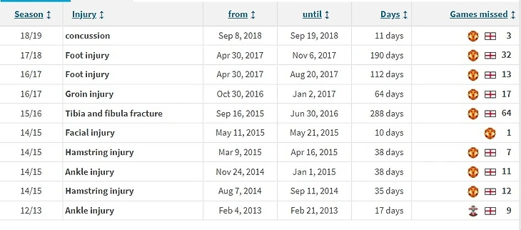 После перехода в «Юнайтед» у Шоу 264 пропуска из-за различных повреждений, у Фила Джонса 259, у Антони Марсьяля – 88.