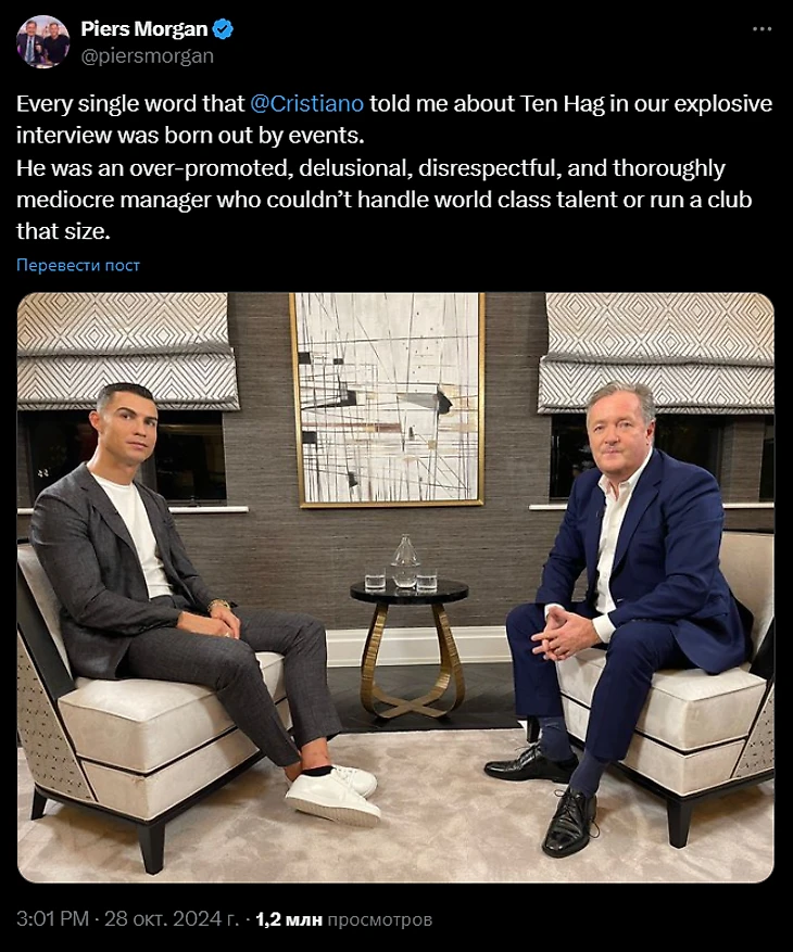«Каждое слово, которое Криштиану сказал мне о Тен Хаге в нашем интервью, с. Он был чрезмерно разрекламированным, недальновидным, неуважительным и совершенно посредственным менеджером, который не мог справиться с талантами мирового класса или управлять клубом такого масштаба».