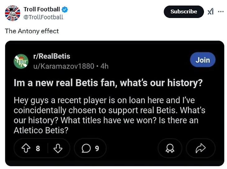 💭 «Эффект Антони: «Я новый фанат «Бетиса», что у нас за история? Привет, ребят, клуб взял в аренду одного игрока и я вдруг решил поддерживать «Бетис». Какая у нас история? Какие трофеи мы брали? Существует ли «Атлетико Бетис»?»