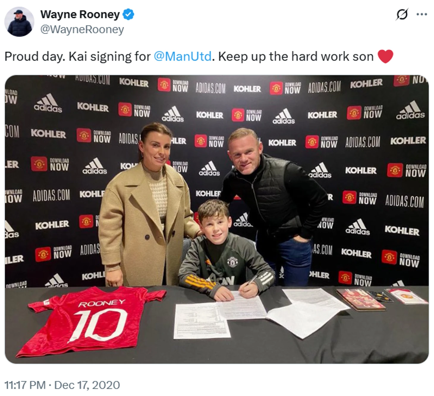 В далеком 2020 году Кай Руни подписал контракт с «Манчестер Юнайтед». Тогда гордый отец писал в соцсетях: «Знаменательный день. Кай подписал контракт с «Майн Юнайтед». Продолжай трудиться, сын».