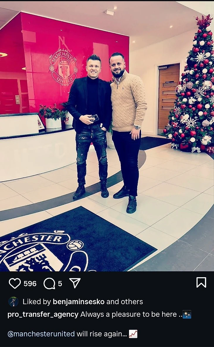 Фанаты пошли дальше и провели маленькое расследование. Нашли прошлогоднее фото агентства Pro Transfer Agency, на котором Элвис Башанович, агент Шешко, стоит на клубной базе «МЮ». «Всегда приятно быть здесь. «Манчестер Юнайтед» снова поднимется», – гласит подпись. Рядом стоит лайк Беньямина Шешко.