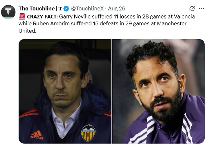 «Безумный факт: Гари Невилл потерпел 11 поражений в 28 матчах в «Валенсии», а Рубен Аморим потерпел 15 поражений в 29 матчах в «Манчестер Юнайтед».