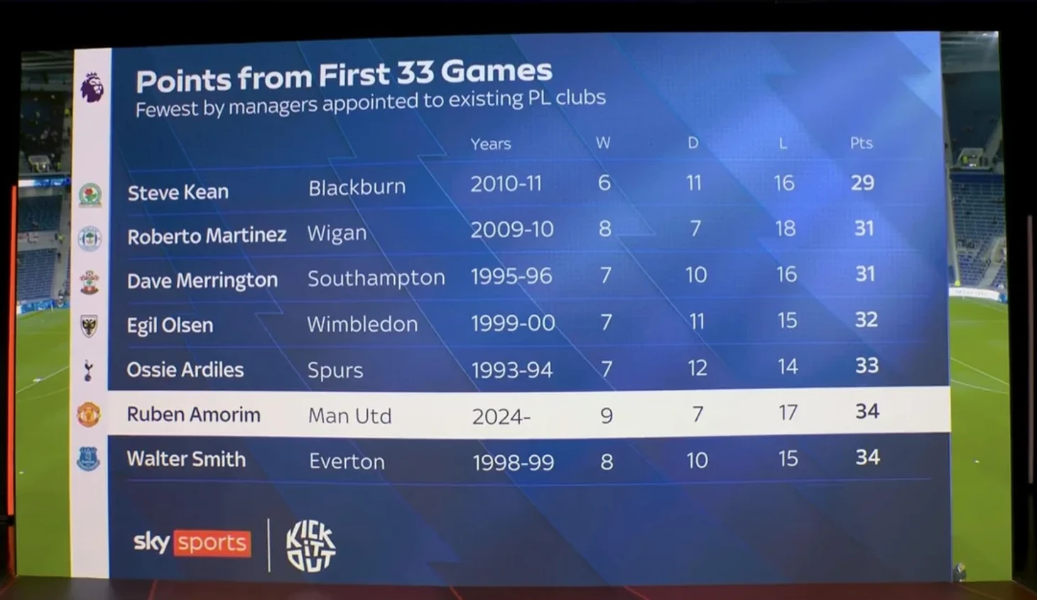 Этот же телеканал решил добить фанатов «Юнайтед» другой статистикой. Они сравнили старт других тренеров АПЛ с тем, что получилось у Аморима, и выяснили, что хуже него начинали только пятеро: Стив Кин в «Блэкберне», Роберто Мартинес в «Уигане», Дэйв Меррингтон в «Саутгемптоне», Эгил Олсен в «Уимблдоне» и Освальдо Ардилес в «Тоттенхэме».