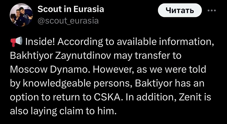 Главный вопрос заключается в том, чего хочет сам игрок? Если вариантов из Европы нет, то есть высокие шансы, что Зайнутдинов вернется в РПЛ. Многим болельщикам ЦСКА хотелось бы снова увидеть Бахтиера в команде, но нужен ли футболист Николичу при укомплектованном составе?