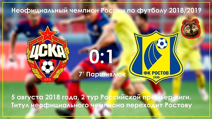 Вчера во втором туре чемпионата страны произошла смена неофициального чемпиона. В не самом зрелищном матче даже по российским меркам "Ростов" за счёт быстрого гола Паршивлюка увёз из Москвы не только победу над ЦСКА, но и сей переходящий титул по версии этого блога.
