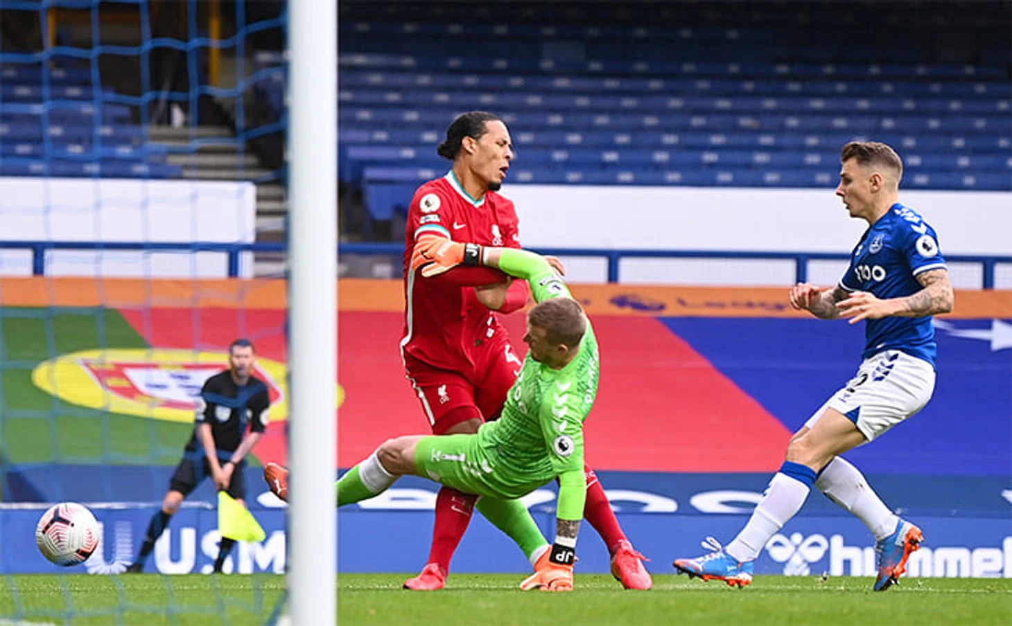 Давайте разберемся, что конкретно произошло. Ван Дейк оказался в чужой штрафной после стандарта – и вылетел на ударную позицию после навеса, когда ему в ноги прилетел Джордан Пикфорд. Выглядело это максимально жестко.