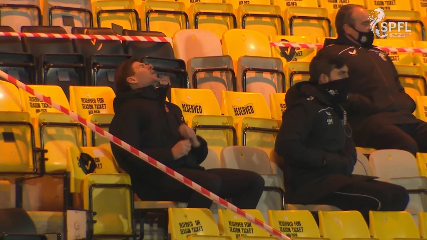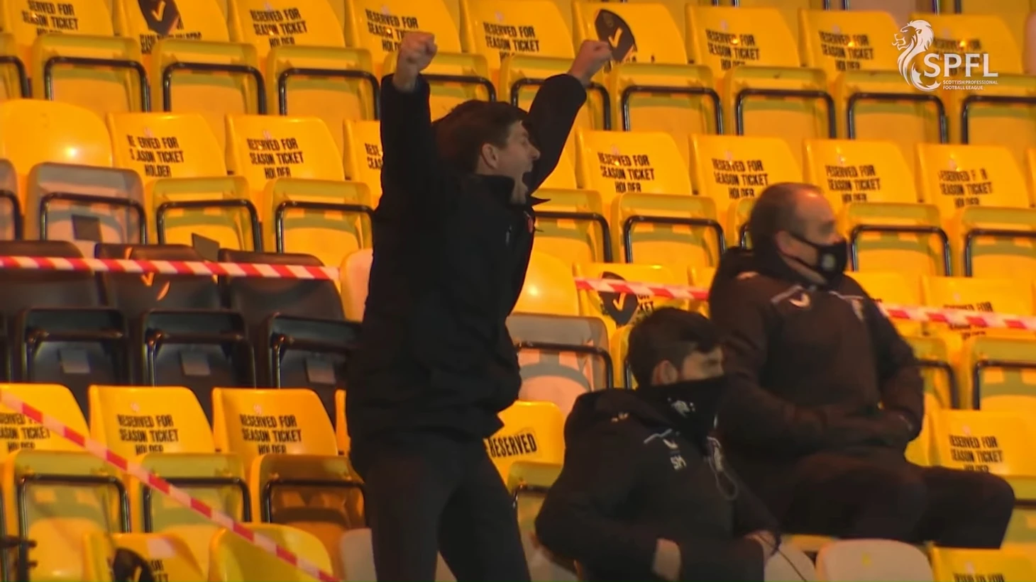 В итоге Стивен Джеррард просидел весь второй тайм на пустых трибунах. На опасные моменты реагировал эмоционально – на пустом стадионе его было вполне слышно. А вот так тренер «Рейнджерс» отметил гол Конора Голдсона, отмененный из-за офсайда.