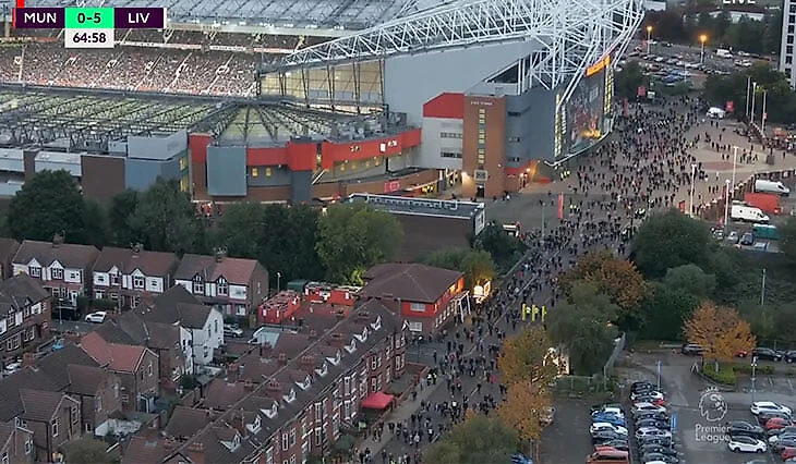 После удаления игра успокоилась: «Ливерпуль» держал мяч, «Юнайтед» прижался к воротам. А фанаты потихоньку потянулись со стадиона. Правда, не так массово, как кажется на этом плане.