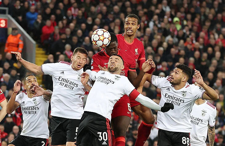 «Ливерпуль» стартовал на «Энфилде» против «Бенфики» классическим голом с углового: Ибраима Конате вколотил с навеса Константиноса Цимикаса.
