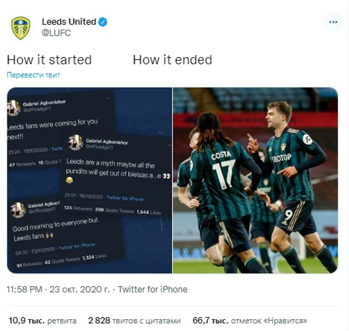 Но красивее всех пару лет назад Агбонлахора приложил «Лидс». За пару дней перед матчем «Астон Виллы» и «Лидса» в 2020-м Габриэль твитнул: «Лидс» – просто миф, может эксперты просто вылезут из задницы Бьелсы?».