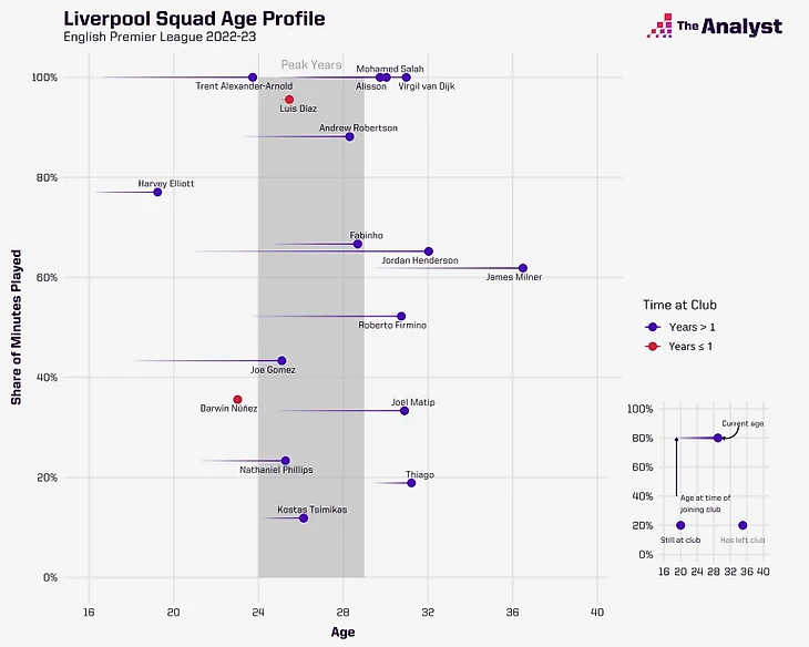 Вообще, перестройка назрела. Против «МЮ» Клопп выпустил в старте шесть игроков старше 30 лет, а издание The Analyst показало любопытную инфографику: в ней видно, что если брать за пиковые годы футболиста период 24-28 лет, для большинства лидеров «Ливерпуля» этот период уже позади.