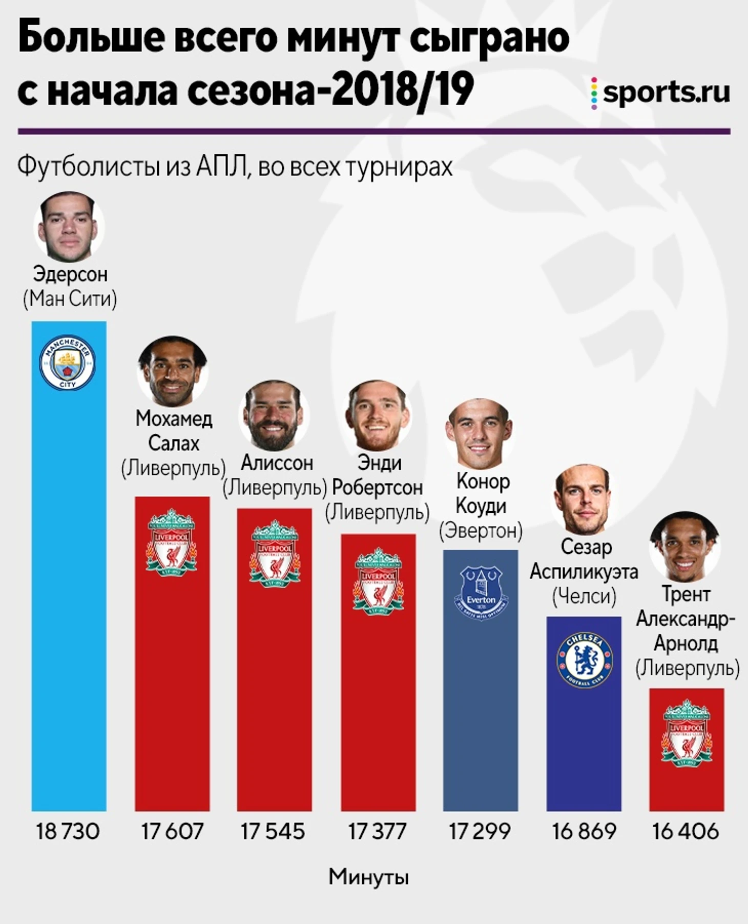 Вот еще показательная статистика. Sky Sports привел данные по проведенным минутам среди игроков АПЛ с сезона-2018/19. В топ-7 есть четыре игрока «Ливерпуля».