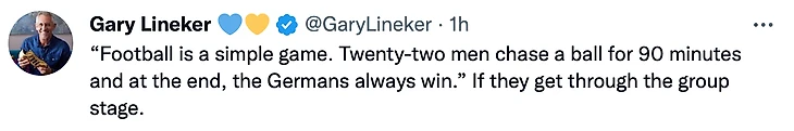 Цитата долго оставалась неизменной – но теперь у нас появилась обновленная версия! После сенсационного вылета Германии с ЧМ-2022 комментатор добавил к ней еще одно предложение. Вот твит Гари сразу после матча: