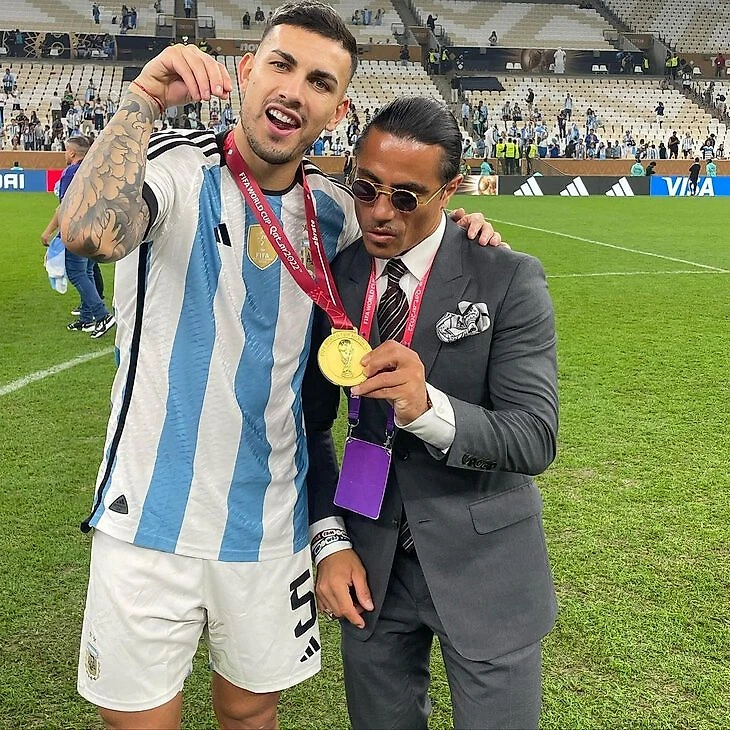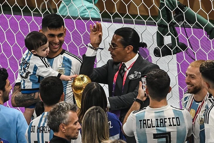 Прославившийся видео, на которых он изящно солит мясо повар оказался на поле во время празднования Аргентиной победы в финале чемпионата мира, и, кажется, был там явно лишним.