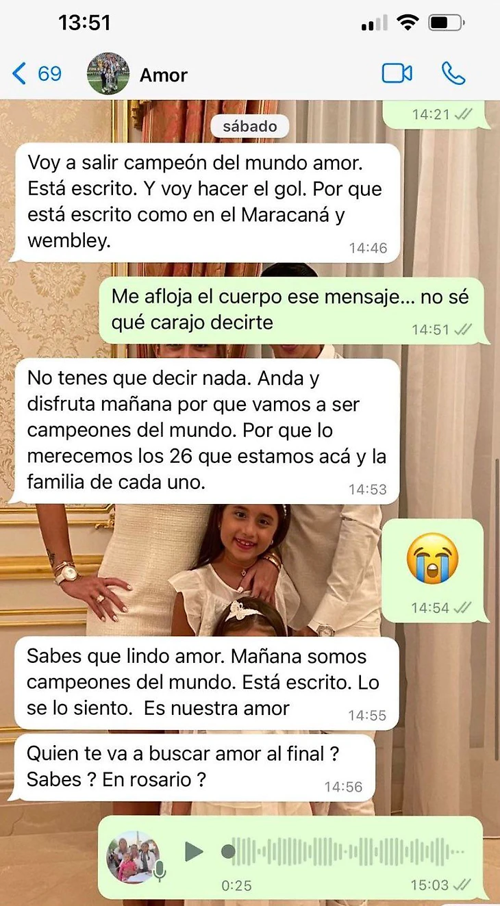 Жена Анхеля Ди Марии Хорхелина Кардосо выложила в соцсетях скриншот сообщений из WhatsApp, которые прислал ей муж за несколько часов до финала чемпионата мира.