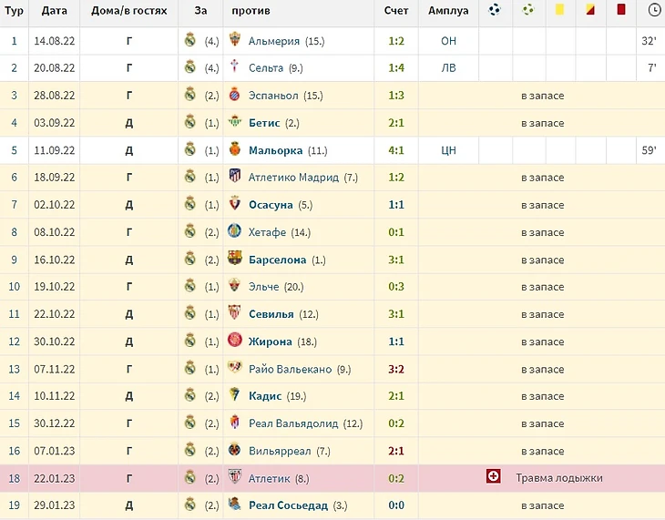 В Ла Лиге он последний раз выходил на поле в сентябре, а в целом его сезон выглядит так: