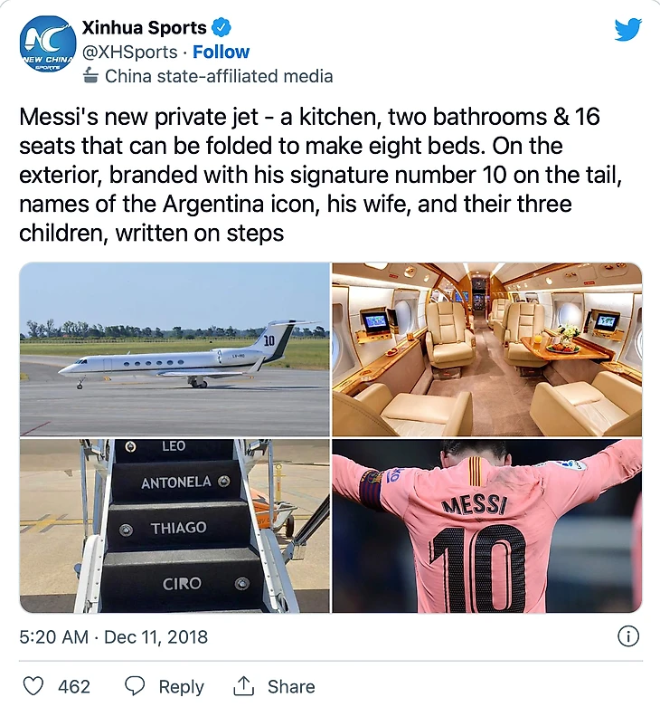 Месси летает на частном самолете стоимостью 15 миллионов долларов.