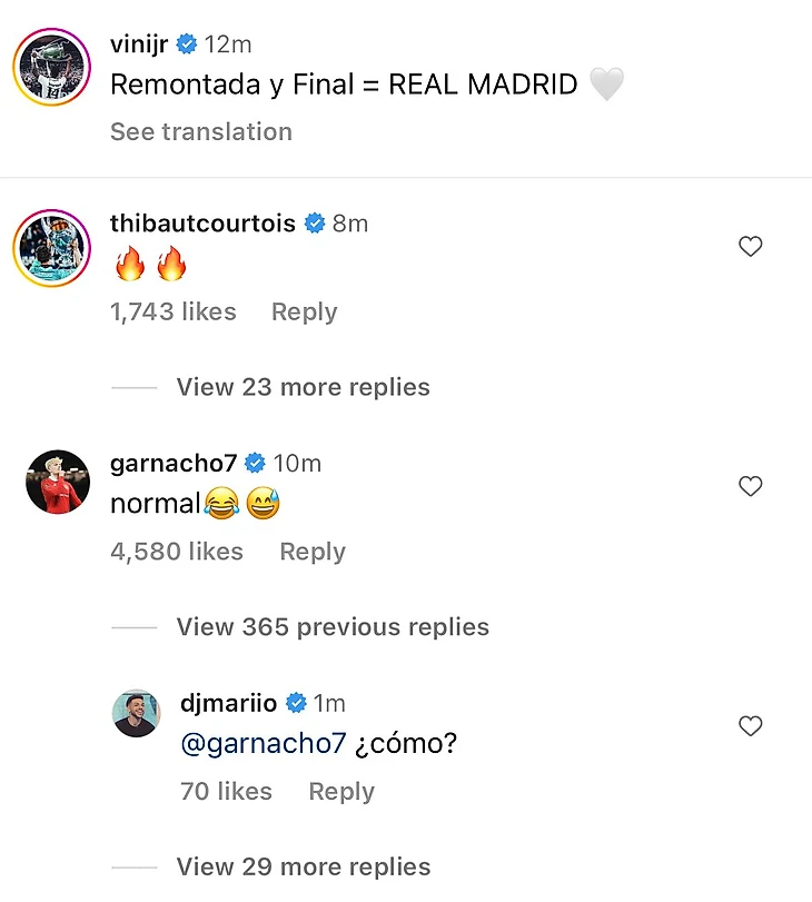 Естественно, в комментариях отметились партнеры Винисиуса по «Мадриду», но фанаты обратили внимание на коммент форварда «Манчестер Юнайтед» Алехандро Гарначо.